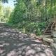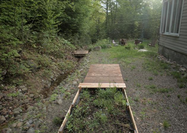 Il y a un espace pour un feu extérieur avec un fauteuil berçant, des chaises Adirondack et un deck en bois offrant une belle vue sur la forêt et la chute. On peut y méditer, faire du yoga ou s’étirer au pied du ruisseau que mère nature nous donne occasionnellement au printemps et après les pluies.