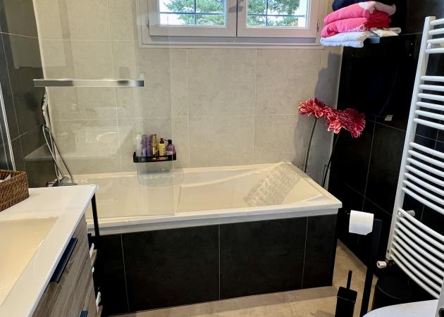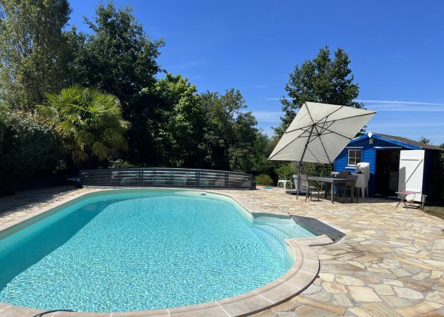 Je vis dans ma maison sur un terrain avec parking fermé et piscine