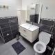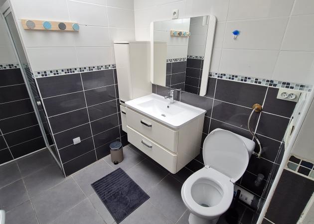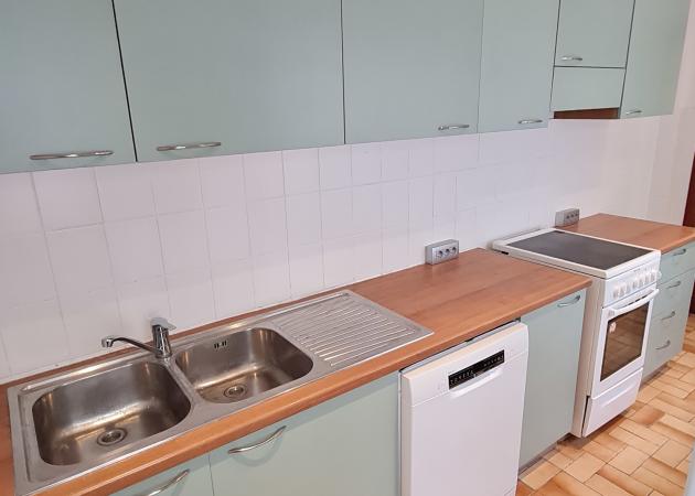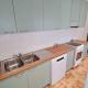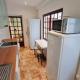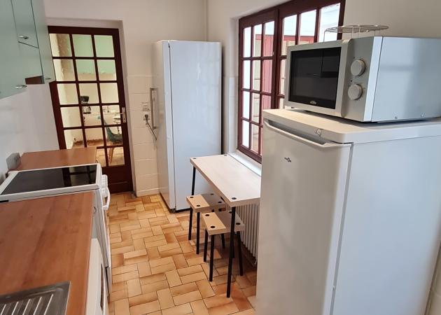 - Cuisine entièrement équipée en équipement et ustensiles avec de nombreux espaces individuels. Une petite table et 2 tabourets complètent l’ensemble.