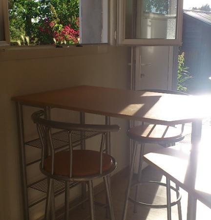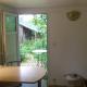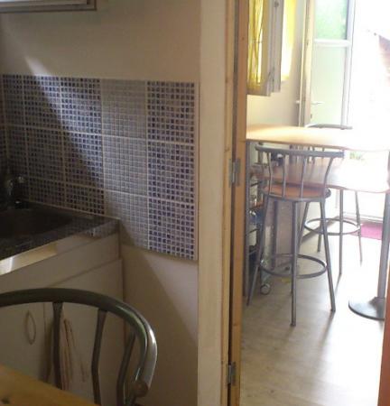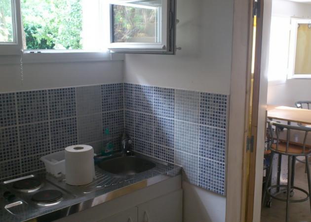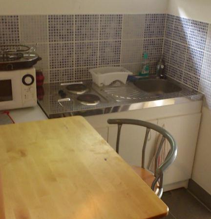 - un petit espace cuisine de 4m2, donnant sur la chambre, mais fermé par une porte, avec un évier, un petit réfrigérateur congélateur neuf, deux plaques de cuisson, un four à micro-onde faisant aussi four traditionnel et une table murale et un tabouret.