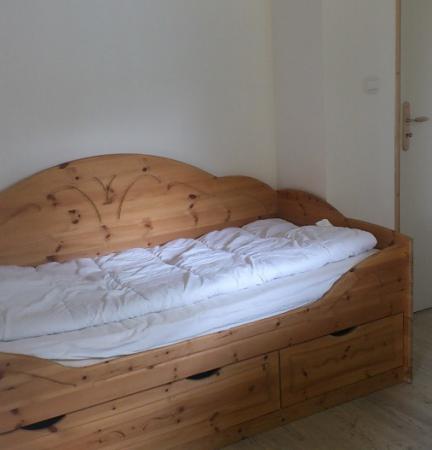 - Une chambre de 11 m2, équipée d'un lit avec trois tiroirs, d'une table à deux niveaux (bar et bureau) avec étagère latérale, chaise, armoire à linge, et tabourets de bar, antenne TV, étagère TV...