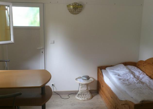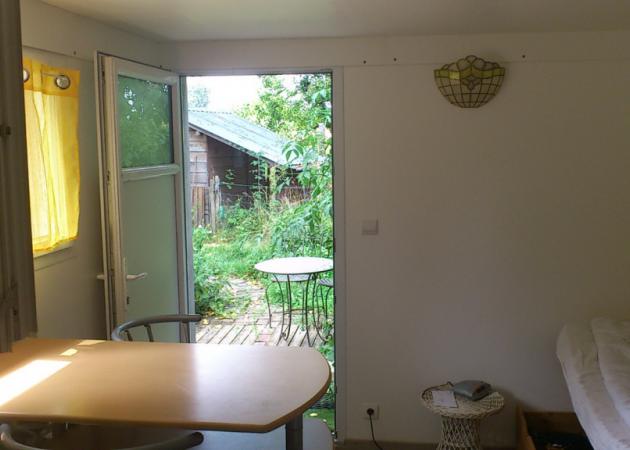 Studio meublé avec petite cuisine équipée séparée et salle d'eau attenante ouvert sur un jardin et terrasse, avec table et chaise de jardin, en rez de chaussée de notre domicile. Entrée totalement indépendante, logement insonorisé. Très grand jardin, au calme, dans un cadre de nature verdoyante, avec ruisseau, grands arbres, potager... Parc de détente à proximité, avec parcours sportif, pêche ou balade. Vous aimerez la tranquillité, la proximité de petits animaux (poules, moutons d'Ouessant…). Nous vivons aux étages.