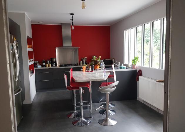 Cuisine spacieuse et lumineuse donnant sur terrasse et jardin, salle de bain indépendante.