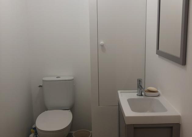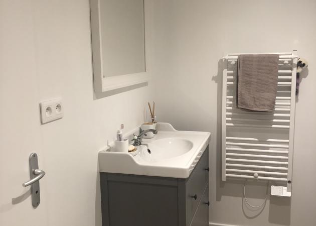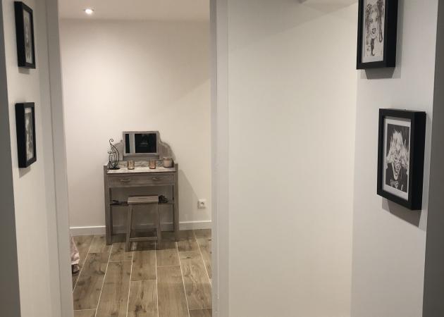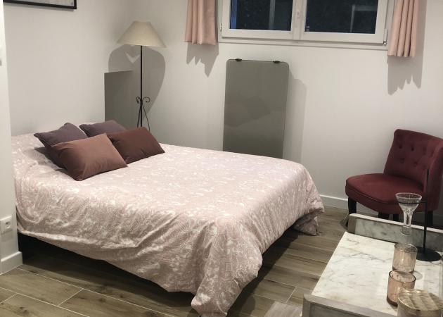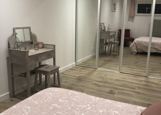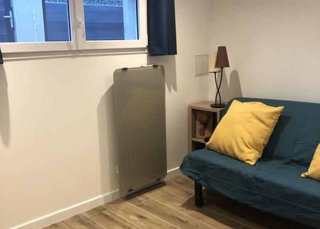 Logement spacieux d'environ 28 m2 avec entrée indépendante (par garage) mettant à disposition un espace privatif et rénové à un étage différent de celui du lieu de vie de la famille pour une parfaite quiétude et indépendance, comprenant : grande chambre, petite pièce de vie (canapé, table basse avec plateau relevable pour le repas, grand bureau), salle de bains, wc.