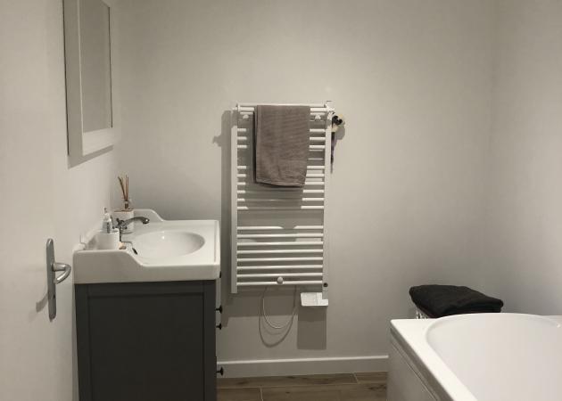 A disposition : linge de lit et de bains, produits douche et cheveux, sopalin, papier toilette, torchon, thé, tisane, café.