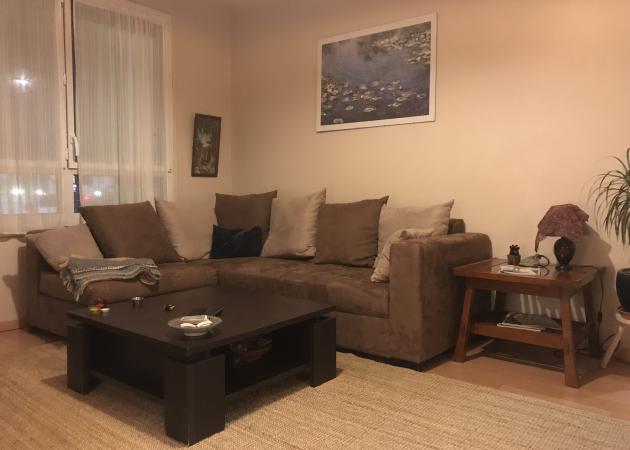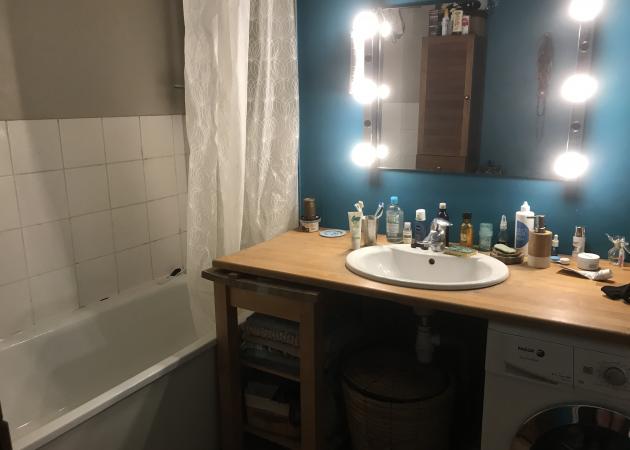 Partage du salon avec TV, de la cuisine équipée avec plaques induction, four et four à micro-onde, et de la salle de bain avec baignoire et lave linge.