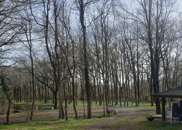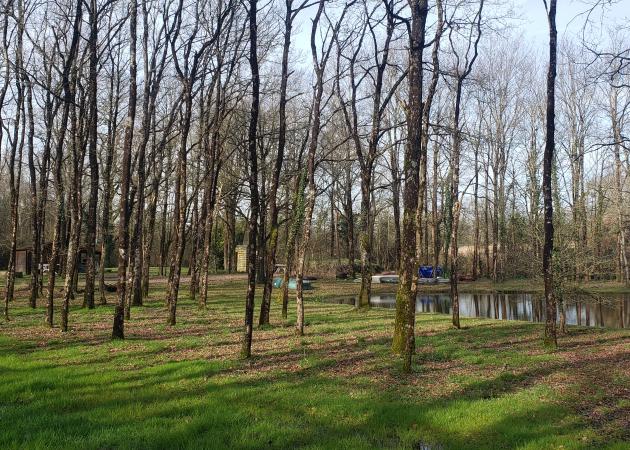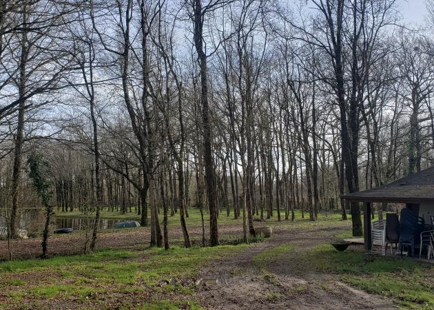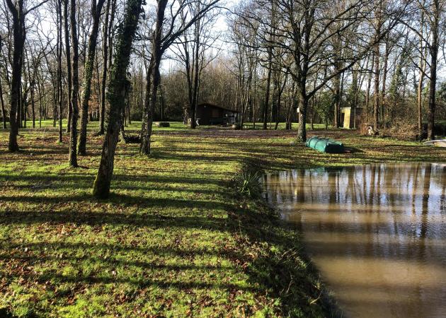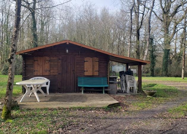Bel espace de 1000 m2 avec un étang + chalet équipé (frigo, micro onde, gaz, cafetière, bouilloire, vaisselle, table + chaises)
