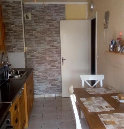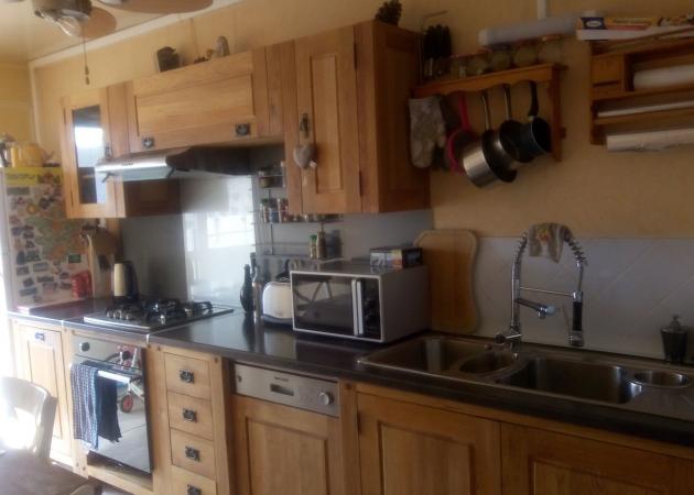 Cuisine moderne et équipée, "ambiance cosy" comme les chalets de montagne. Grand balcon avec canapé pour s'asseoir et petite table d'appoint.