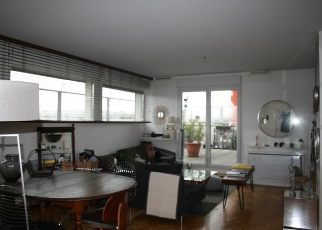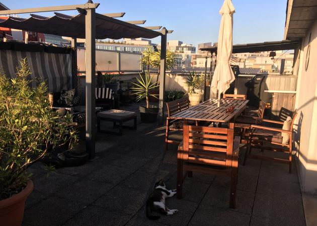 Le reste de l'appartement est accessible : pièce de vie (27 m²), cuisine (7m²), terrasse (72m²).