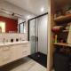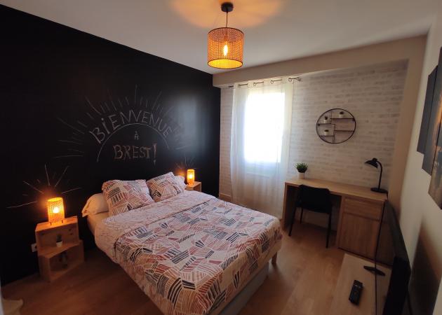 La chambre est équipée d'un lit double, d'un bureau, d'une télévision (lecteur DVD, Netflix, Disney) et de rangement.
