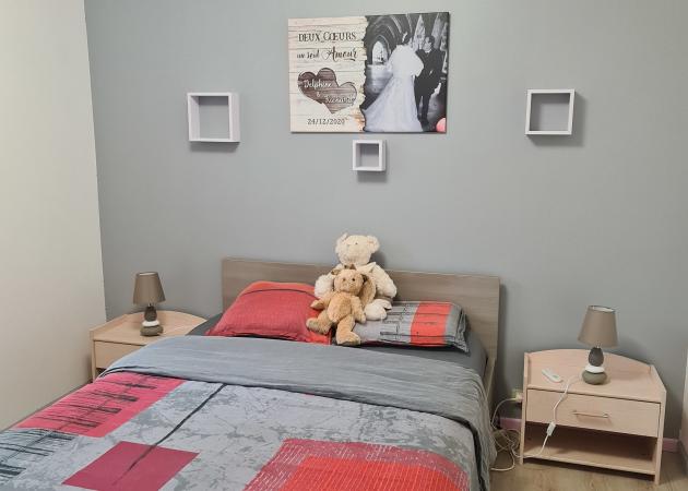 2 chambres se composant d un lit 140 et d un lit simple, salle se bain partagée ainsi que les toilettes pour l une et une autre chambre avec salle de douche et toilettes privé.