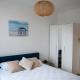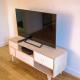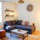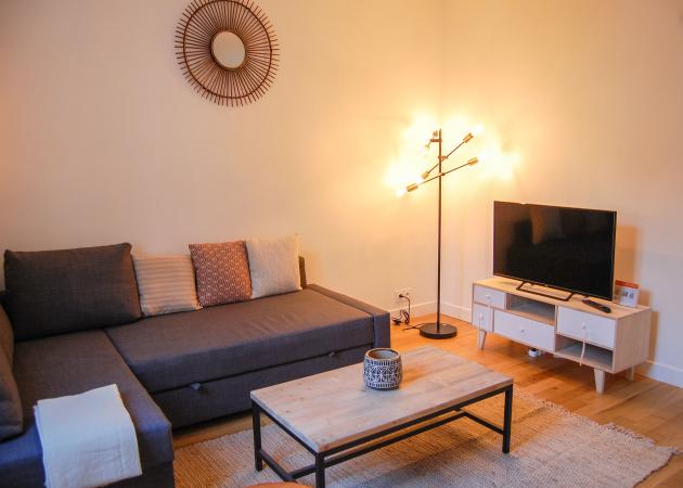 Il comprend une pièce de vie avec un grand canapé convertible avec sa table basse, un coin bureau, une grande télévision.