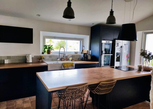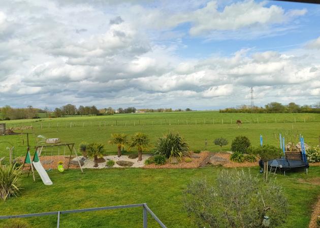 Vous pourrez prendre votre petit déjeuner dans la cuisine et si le temps est au rdv nous disposons d'un grand jardin avec vue sur la campagne et nos 2 poneys.