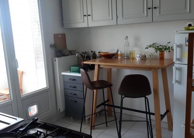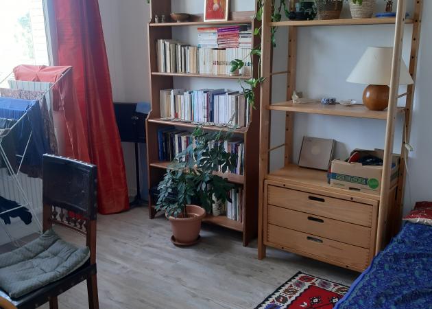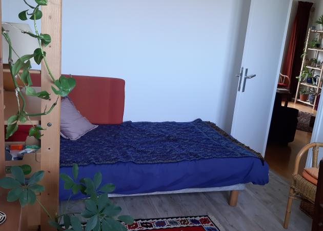 Chambre orientée plein Est dans mon T3 dans une résidence privée années 60, calme, parking possible au pied de l'immeuble.