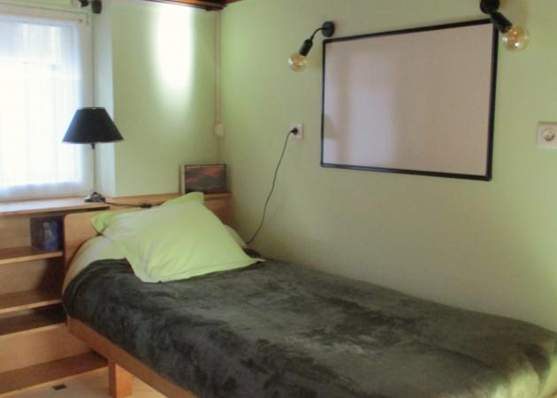 - Chambre : 1 lit 1 pers. (90 x 200) avec sa literie + 2 placards-penderies avec cintres + 2 rangements étagères-bibliothèque + rangement sous lavabo + table ovale et ses 2 chaises + lampe de chevet et 3 appliques au mur + 2 tableaux blancs pour affichage + corbeille à papier + nécessaire ménage et produits d’entretien + étendoir et pinces à linge.