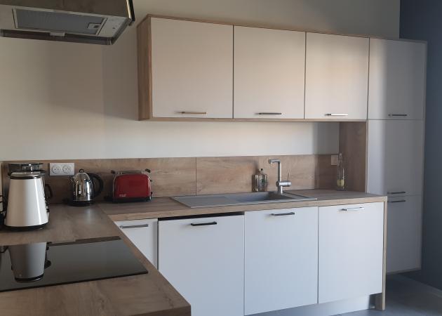1 cuisine aménagée avec four, lave vaisselle, four micro-ondes, plaque de cuisson...