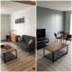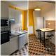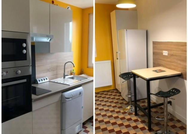 Cuisine intégrée très récente (Août 2020) semi-ouverte avec: four électrique, micro-ondes, combiné réfrigérateur-congélateur, plaque duo induction, lave-linge, sèche-linge, cafetière, bouilloire, vaisselle complète, set de casseroles/poêles et couverts fournis.