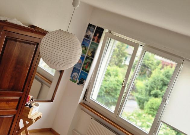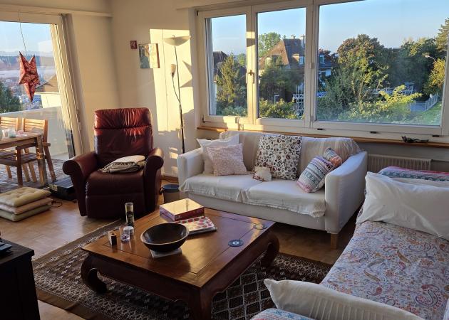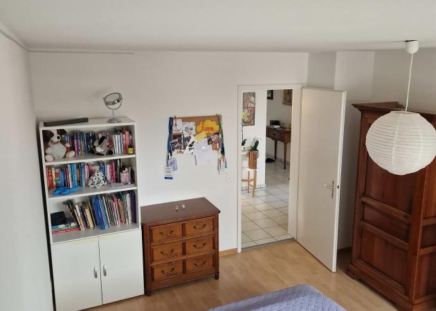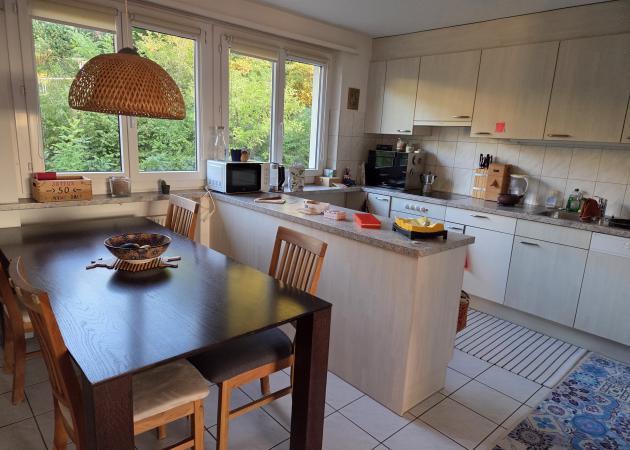 L'appartement offre une grande cuisine et un très belle terrasse (15m2) avec vue imprenable sur la chaîne des Alpes bernoises. Salle de bain à partager. Cuisine à partager.
