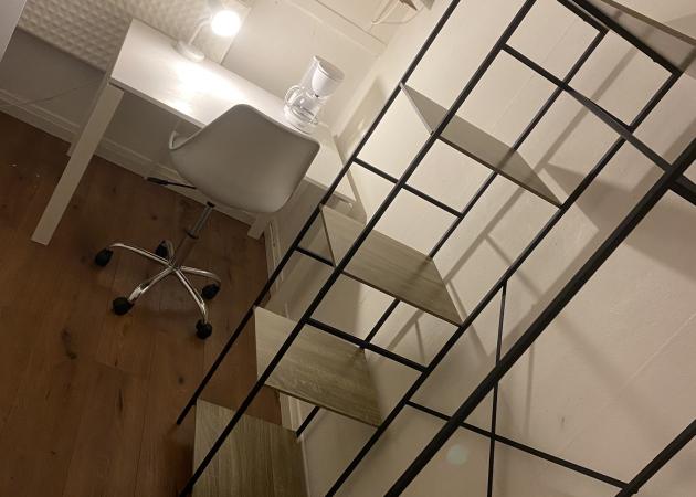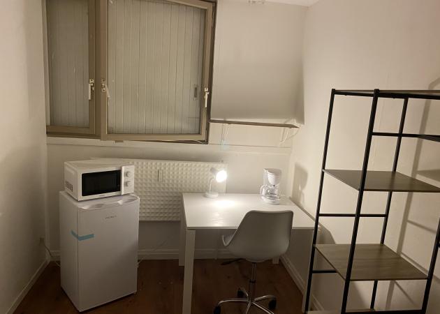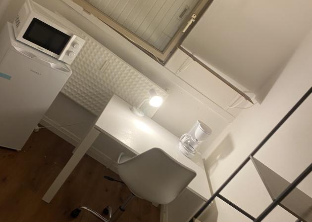 1 chambre de 10 m2 avec lit simple 90x190cm, bureau, chaise de bureau et dressing, un réfrigérateur individuel, une table basse, un micro onde, une cafetière…