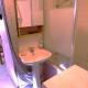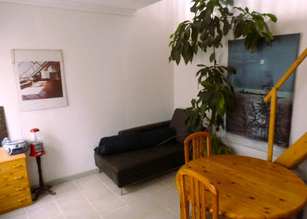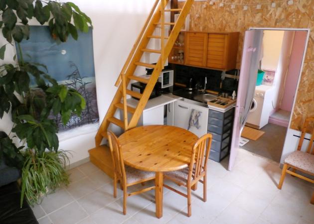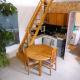 - Au rez-de-chaussée (18 m²) : Pièce à vivre partagée et équipée pour 3 personnes (table, chaises, canapé), coin cuisine équipé (évier, plaques de cuisson, frigo, four micro-ondes, bouilloire, vaisselle, meubles), salle de bain et toilettes séparées.