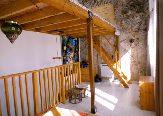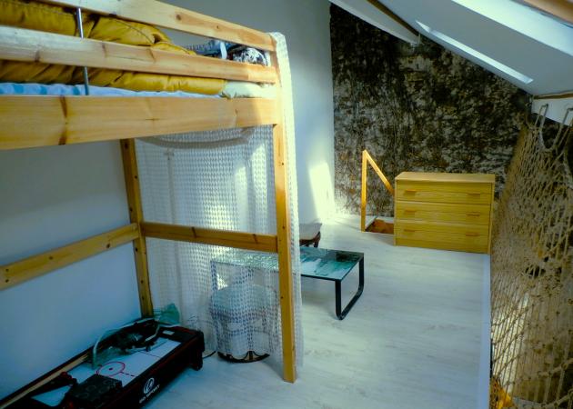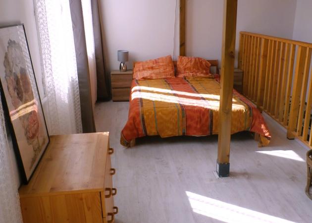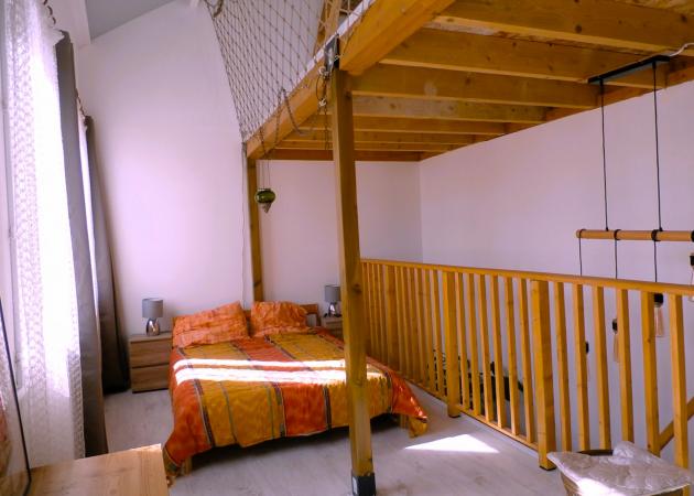 - En mezzanine (10 m²) : Chambre meublée avec lit 1 personne.