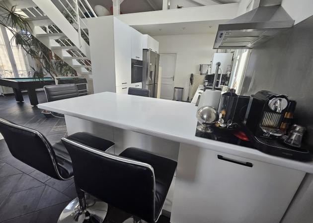 Espace commun : cuisine équipée (four, micro-onde, frigo américain) ouverte sur salle à manger, séjour et salle de jeu (billard), climatisation, buanderie, jardin.