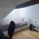 Chambre de 12 m2 sous les toits comportant un lit double, un bureau, une étagère et du rangement sous le lit.