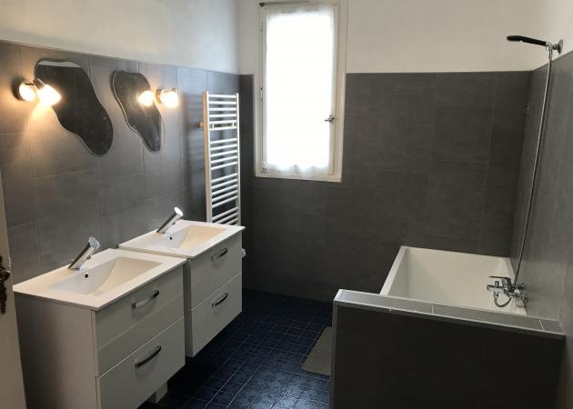 *En rez de jardin, une chambre meublée de 30 m2 avec Salle de Bain mixte Privative offrant à la fois une Douche et une Baignoire, associées à 2 vasques / lavabos.