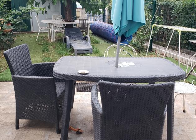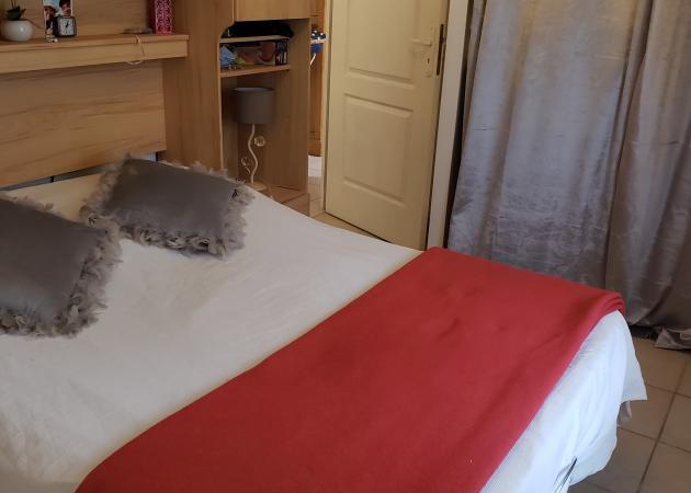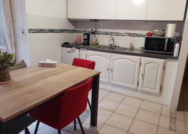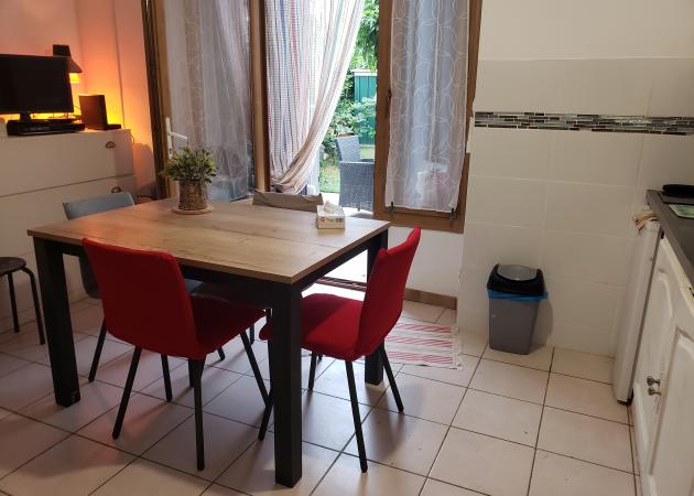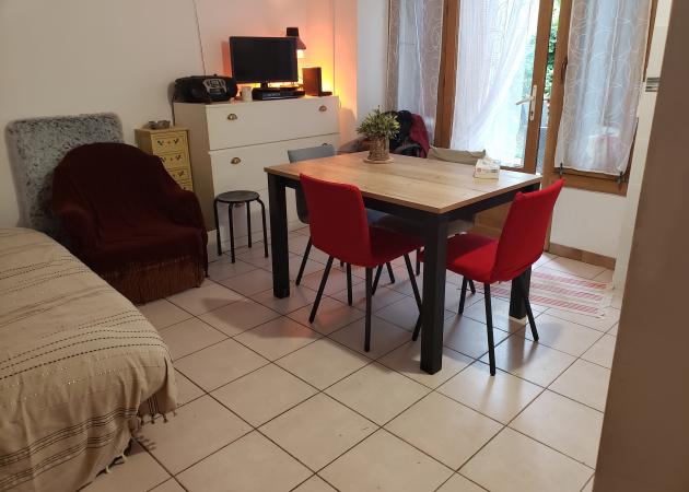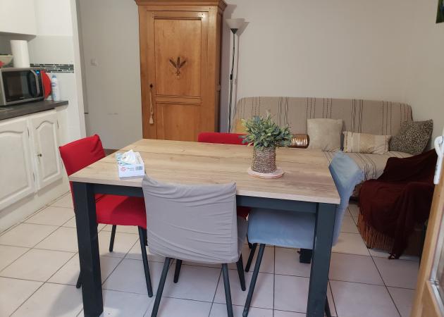 Piece de vie avec clic clac 140 X 190 table à manger et cuisine équipée.