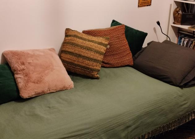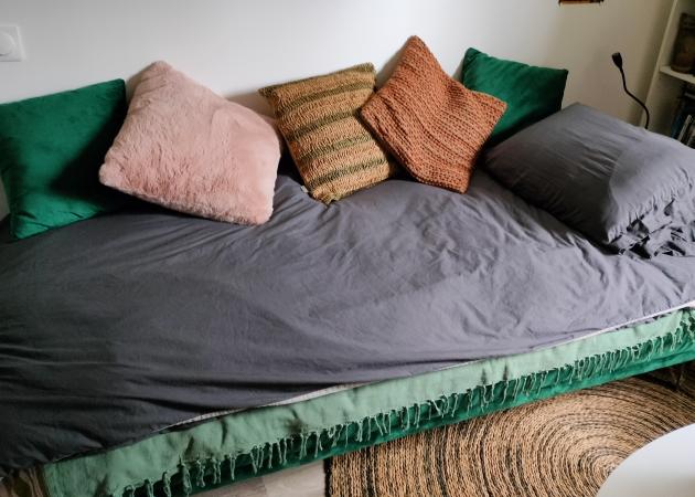 Chambre canapé clic-clac de 90 cm de large, 185 cm de long pour une seule personne. Une commode et une place dans le dressing. Pas de TV dans la chambre.