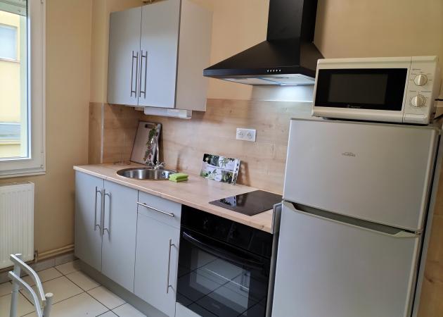 A 17 mn de Belfort, 300m du centre ville, au calme appartement T1 entrée, cuisine équipée séparée, douche, WC, chambre avec bureau, penderie, télé, 2 lits.