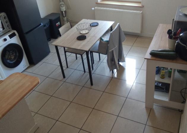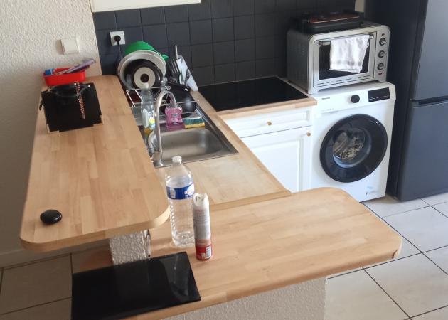 Cuisine : table et chaises, micro-onde, four traditionnel, machine à laver avec hublot, frigo, plaques inductions, machine à café à dosette...