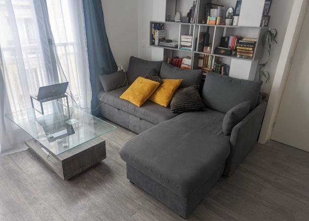 - L'appartement de 38m2 est situé en étage avec ascenseur et dispose d'un salon cuisine d'environ 20m2 dans lequel se trouve le canapé-lit que je vous propose, d'une grande salle de bain et de ma chambre.
