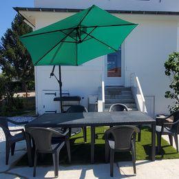 L'espace extérieur se compose d'une belle terrasse idéale pour les repas BBQ du soir, d'un grand jardin, d'un parking voiture fermé pour 6 places et d'un parking vélo.