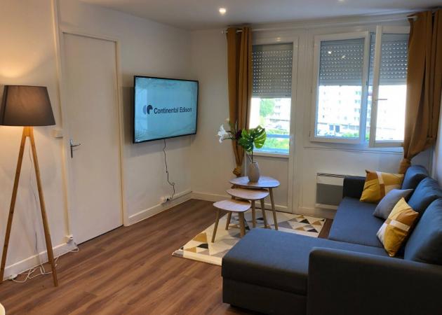 Salon: TV écran plat et grand canapé convertible pour les invités et grande table pour 6 personnes.