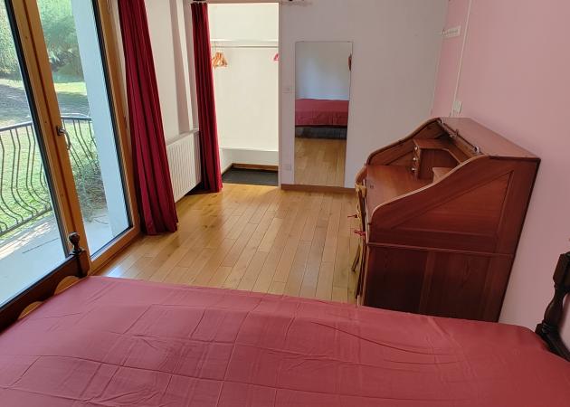 La chambre est meublée (lit simple, bureau et rangements). Elle se situe au premier étage avec un salon et une salle de bain partagée. Le jardin est librement accessible.