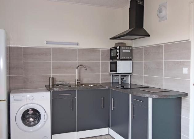 Cuisine équipée neuve : machine à laver, four micro-ondes, four traditionnel, réfrigérateur à froid ventilé, vaisselle complète
