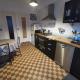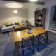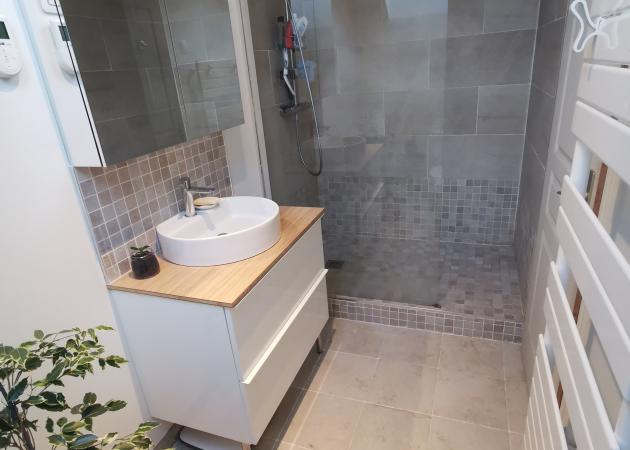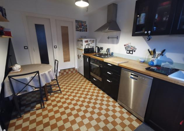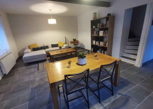 Espaces communs meublés et équipés : cuisine, salon (35m²), 2 salles de bain (baignoire et douche), espace buanderie. La maison dispose également d’un jardin.
