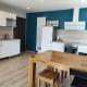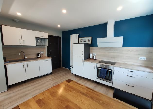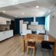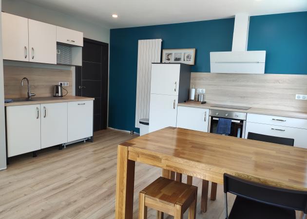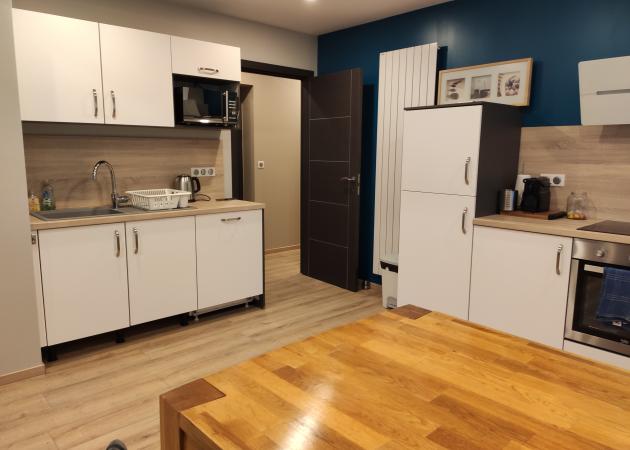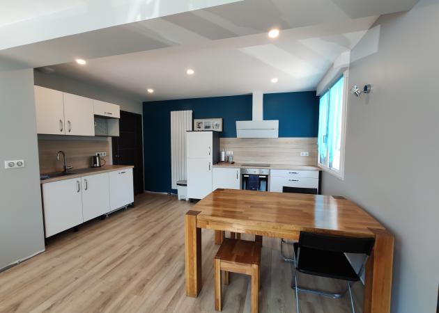 Cuisine entièrement équipée ouverte sur pièce à vivre.