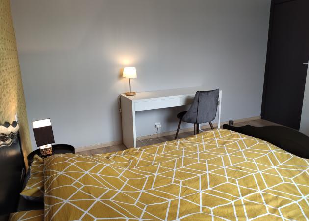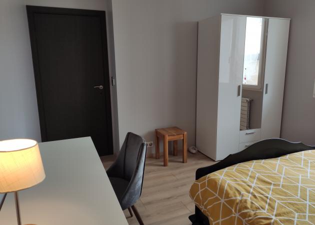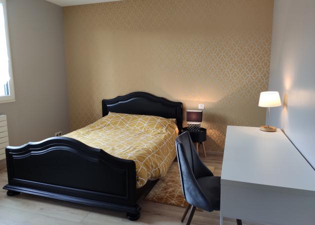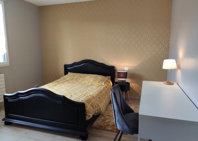 La chambre est équipées d'un lit double, armoire, bureau, rangement, linge de lit.