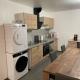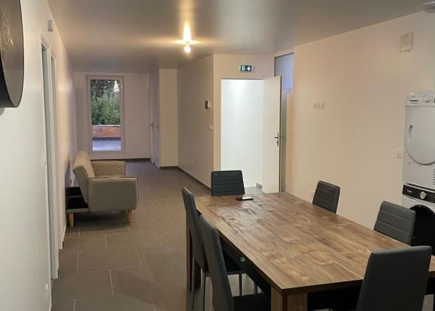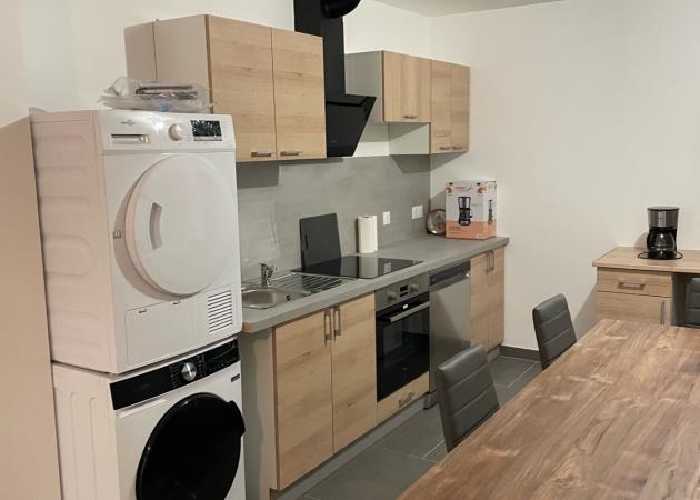 salon et cuisine commune équipe de Lave vaisselle, lave linge, sèche linge four plaque vitrocéramique canape télévision.