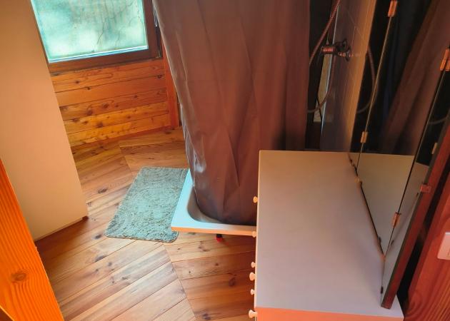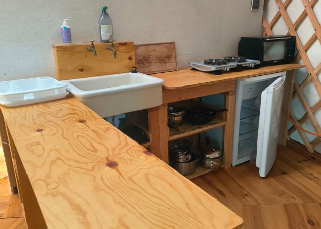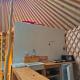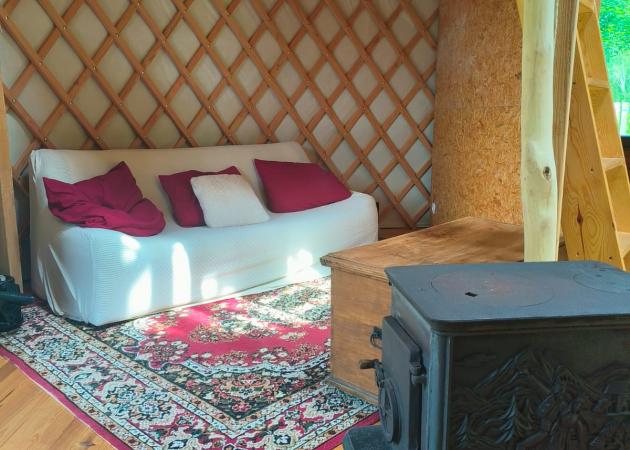La yourte a tout le confort d'une petite maison : électricité, cuisine (taque de cuisson, frigo), salle de bain (douche avec eau chaude, toilette sèche, meuble avec penderie), petit coin salon, lit en mezzanine, etc. Pour le chauffage, la yourte dispose d'une poêle à bois.