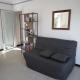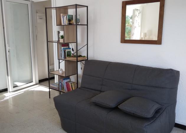 Un canapé-lit 2 personnes neuf, un lit pliant une personne avec un vrai matelas, petite cuisine fermée frigo hotte micro-ondes plaques vitrocéramique.