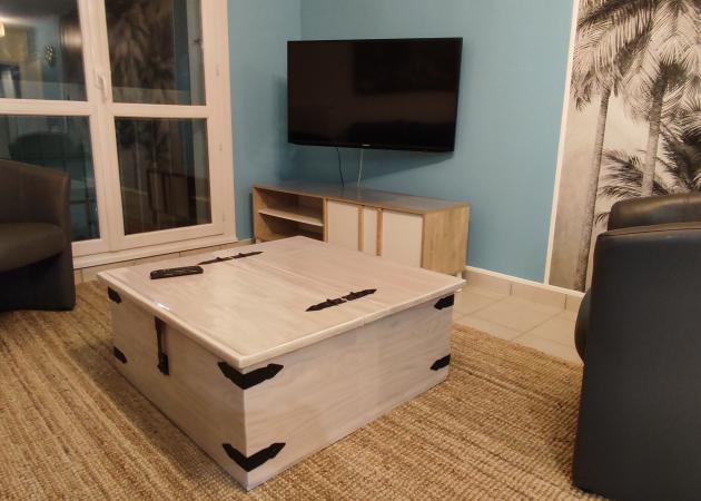 => 1 séjour, d'une superficie de 21m², chaleureux et cosy, dispose d'une porte-fenêtre, d’un canapé 2/3 places, de 2 fauteuils cabriolets, d’une table basse coffre, d’une TV de 45 pouces(115cm) + box, d'un meuble TV, d’une table à manger 180-250 cm (rallonge intégrée), 4 chaises, cloison-étagères