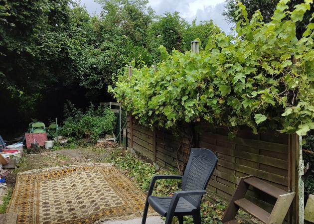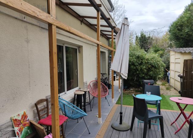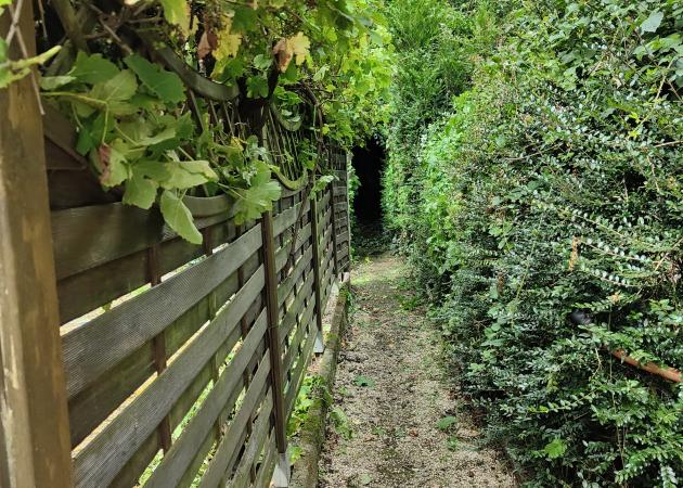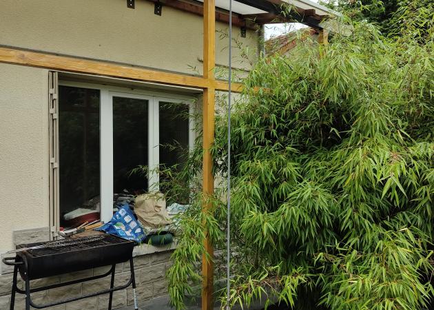 Appartement en rez-de-chaussée isolé complètement de l'entrée côté Rue (boîte aux lettres). Il est situé côté jardins. Jardins au pluriel étant donné qu'il y a deux autres propriétaires qui ont chacun un morceau de jardin dissocié de leur appartement (excentré).