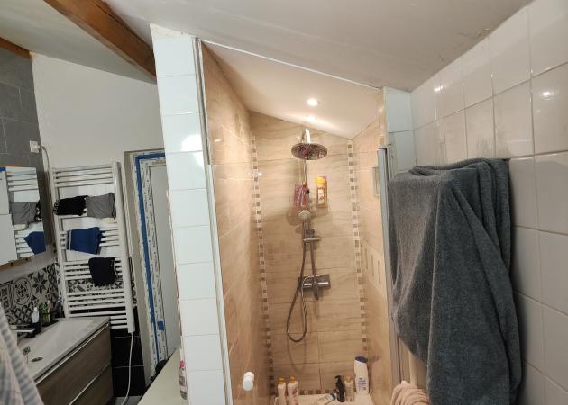 La douche est à l'italienne. Les murs sont entièrement recouvert de carrelage mural. Machine à laver, double sèche serviette (deux séparés).