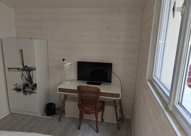 Le sol de la chambre est en parquet. Deux côtés des murs dans la chambre sont en lambris massifs blanc.