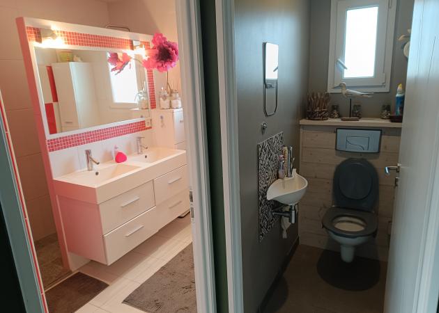 Salle de bain (douche italienne, 2 vasques) et toilette pour les deux chambres