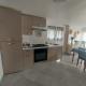 Une cuisine équipée avec une pièce de vie avec un coin salon et un coin repas.