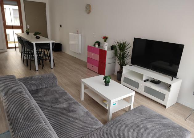 - Un vaste séjour lumineux équipé d'un grand canapé, d’une table basse, d’une télévision avec son meuble à TV